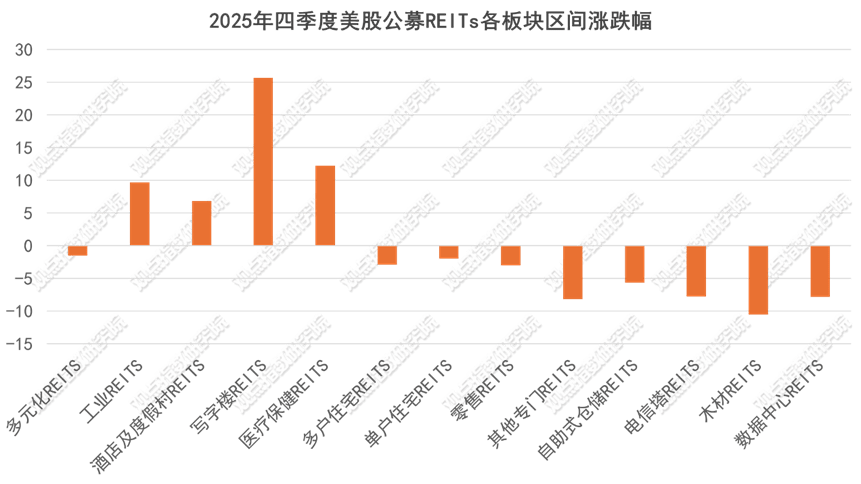 核心支撑在于已公布的2025年第三季度业绩显示,整体REITs公司收入及利润增速均好于市场预期,其中办公REITs盈利相对明显,强化了市场对这两个板块的价值认可。反观下跌板块,自助式仓储REITS受关税影响跌幅达5.69%,多元化REITs多户住宅REITs、零售REITs分别下跌1.53%、2.88%、3.04%,此外电信塔REITs、数据中心REITs等板块也呈现不同程度的下行。