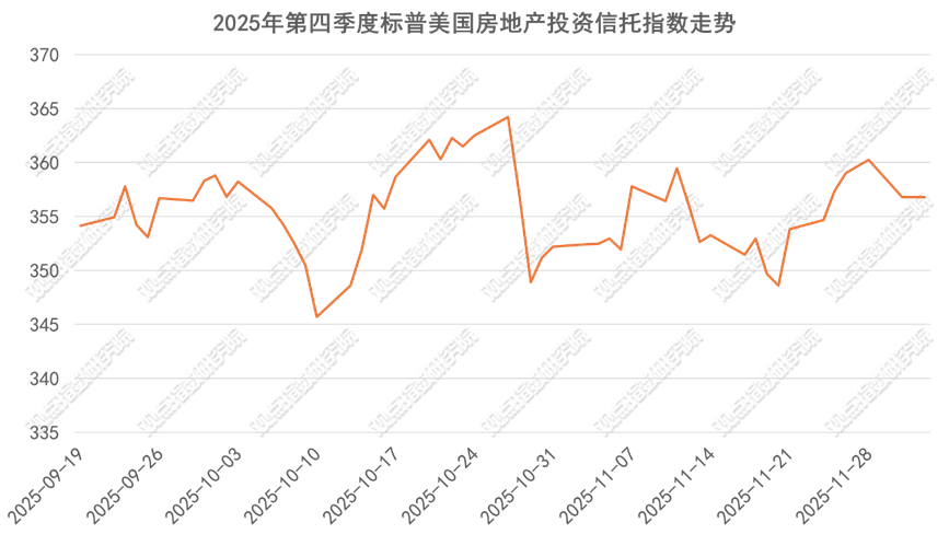 进入11月,指数再次震荡回落,11月21日降至353.82;11月下旬起逐步回升,11月26日达359.0447,12月3日收于356.76,较期初小幅上涨约0.75%。整体而言,指数在三个月内的波动区间为约16.39点(345.72-362.11),振幅约4.6%,显示市场对美国房地产投资信托的价值判断趋于谨慎,但四季度末的小幅回升反映部分资金对行业长期价值的认可,需持续关注宏观经济环境(如中美对等关税政策,利率走势、商业地产需求)对REITs的影响。