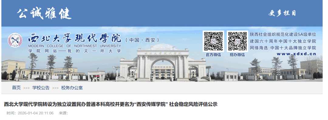 除了榆林学院更名榆林大学迎来教育部公示之外,2026年1月4日,西北大学现代学院官网发布《西北大学现代学院转设为独立设置民办普通本科高校并更名为“西安传媒学院” 社会稳定风险评估公示》。