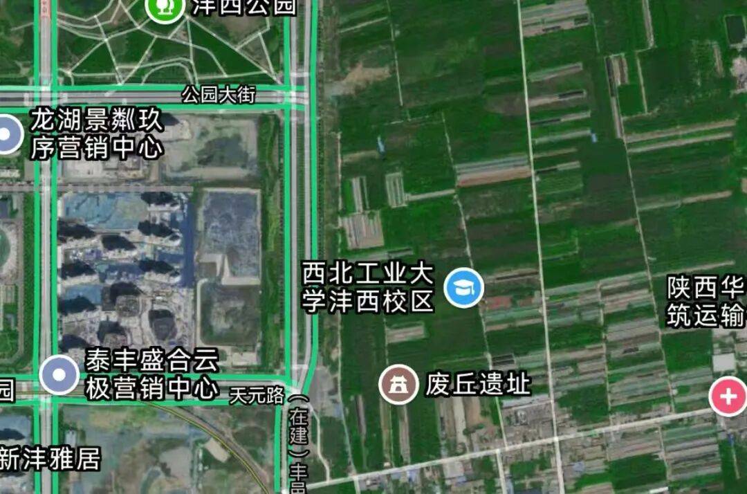 在高德地图上,西北工业大学沣西校区的位置标注已经出现,位置在丰邑大道以东、阿房一路以南,也就是东马坊,西北工业大学沣西校区的南侧则是西北大学沣西校区。