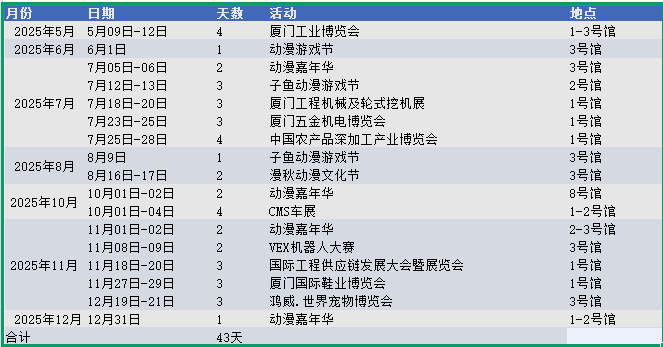 国博中心有11个展馆,其中1号展馆3万㎡,2-10号展馆每个展馆2.4万㎡,有4.2万㎡会议中心,总计约31.2万㎡。相较奥体中心,2025年其展会人流比较有限,作为省内最大单体展览中心,此使用率有很大的进步空间。9.8投洽会移师翔安,给国博中心注入一剂强心剂。