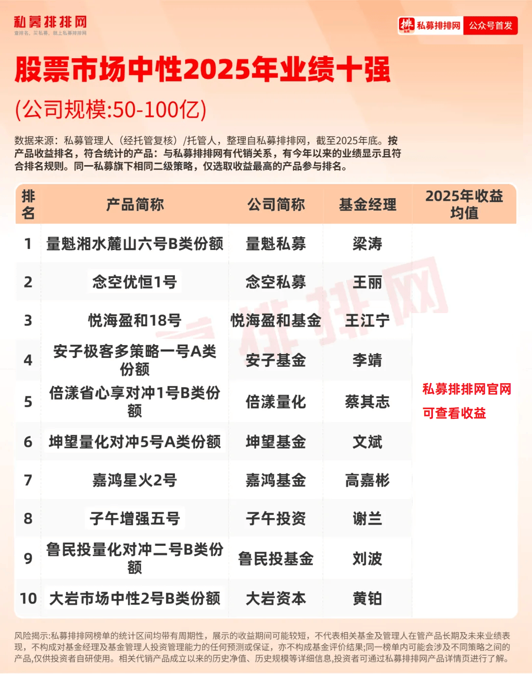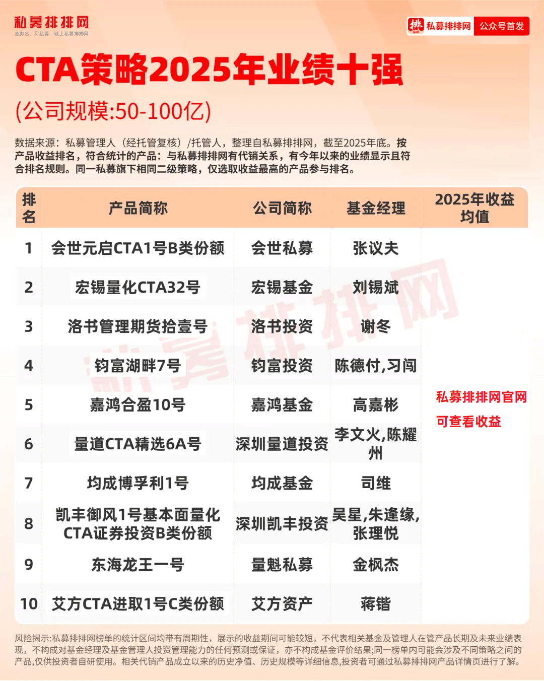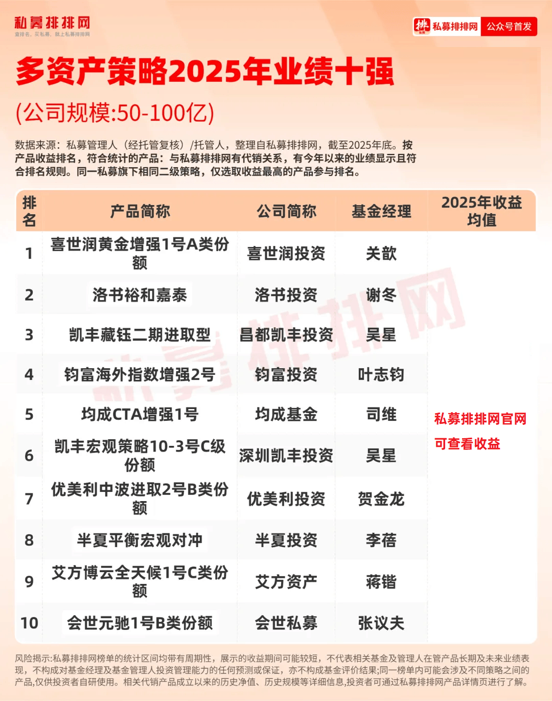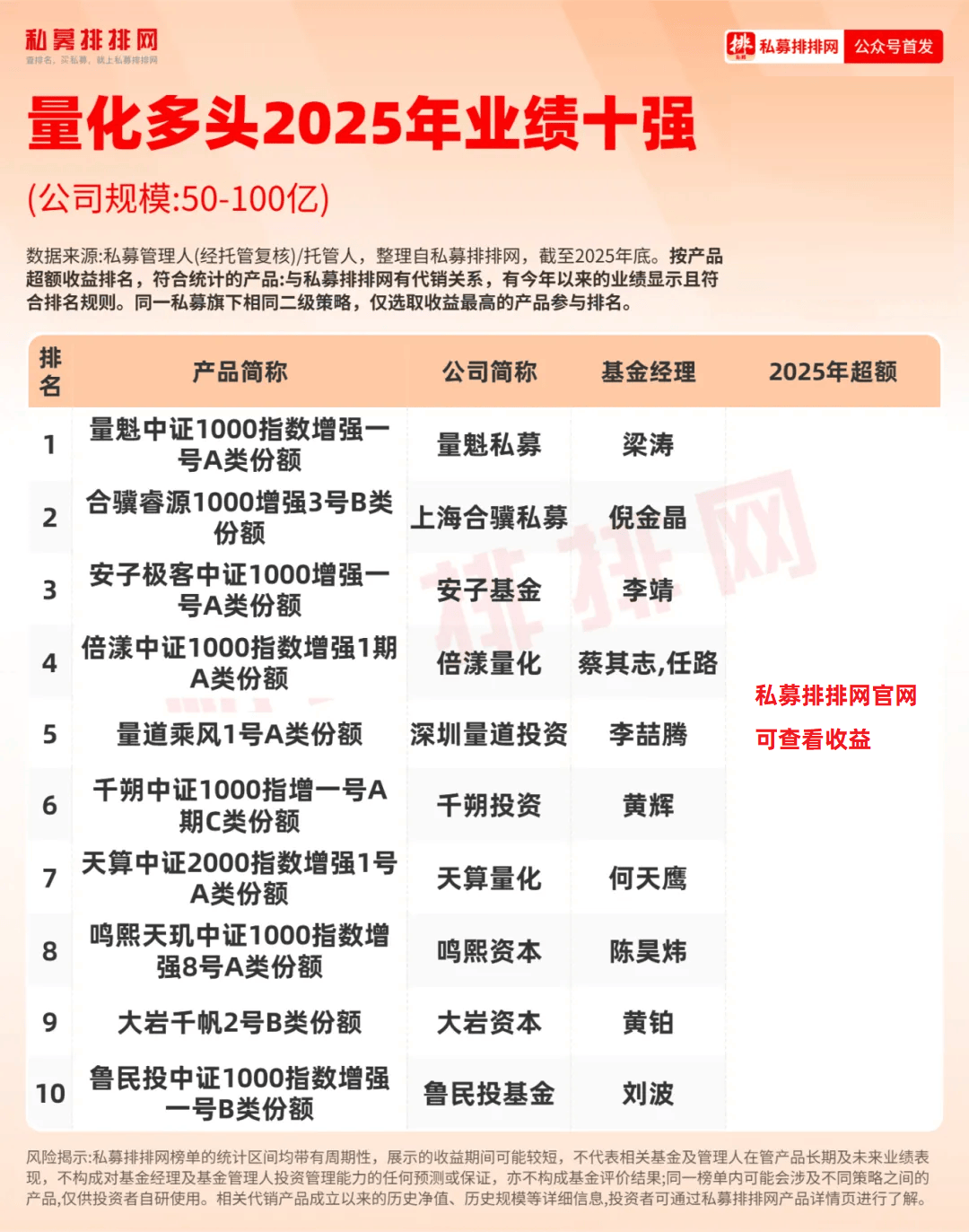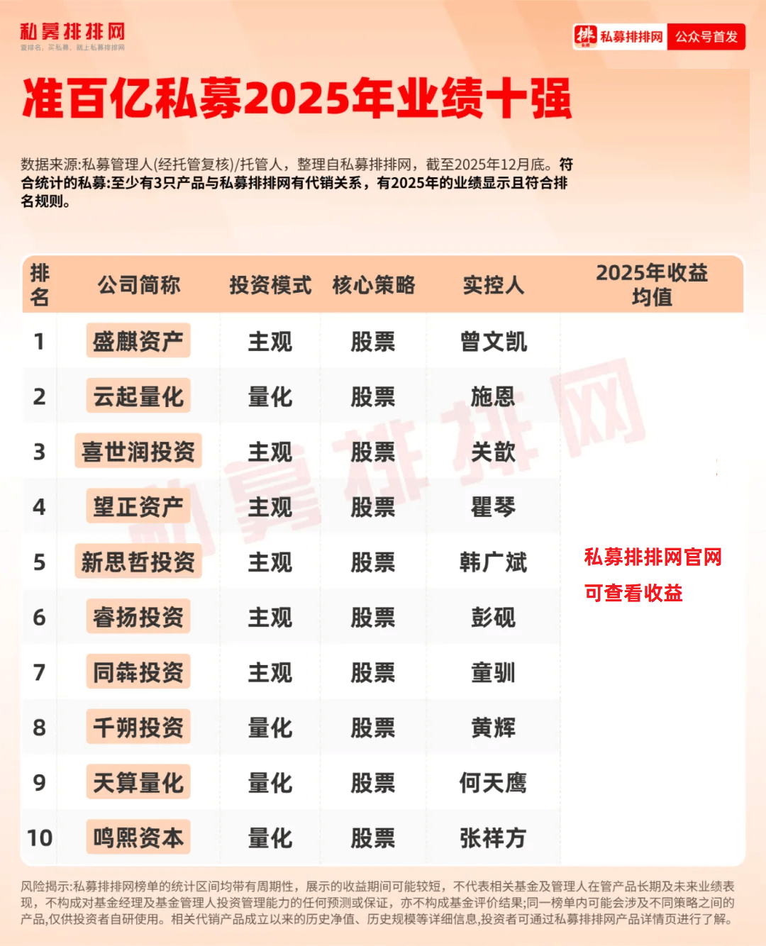 2025年收益前十的“准百亿”私募分别是:盛麒资产、云起量化、喜世润投资、望正资产、新思哲投资、睿扬投资、同犇投资、千朔投资、天算量化、鸣熙资本。