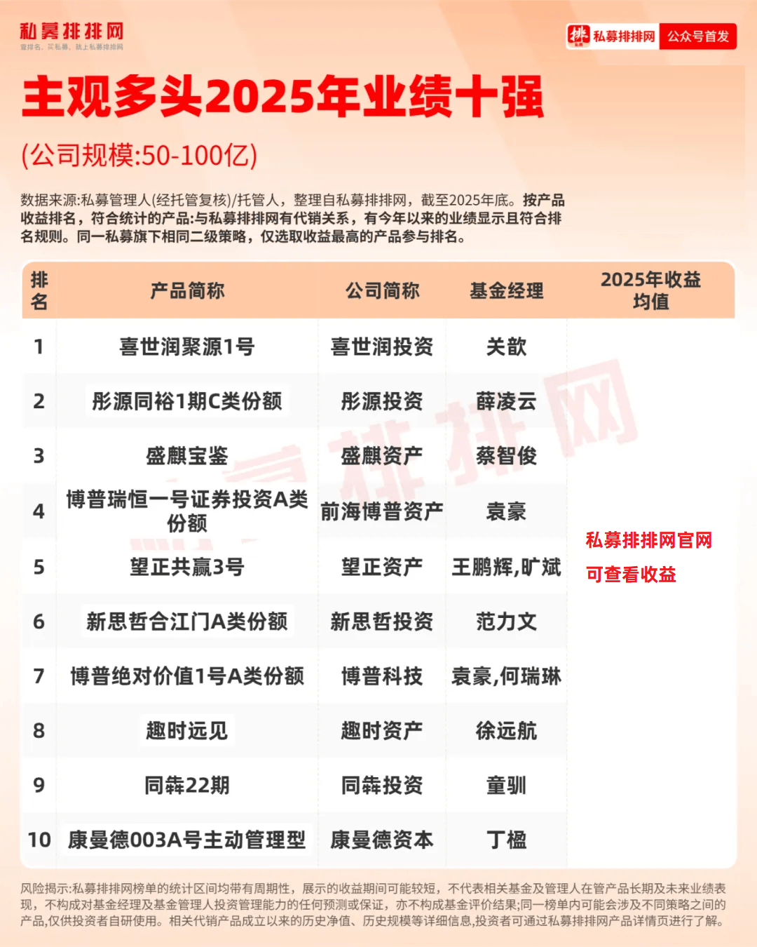 私募排排网数据显示,50-100亿私募旗下有业绩显示的110只主观多头产品,2025年收益均值为36.28%。位居前三的主观多头产品分别来自:喜世润投资、彤源投资、盛麒资产。